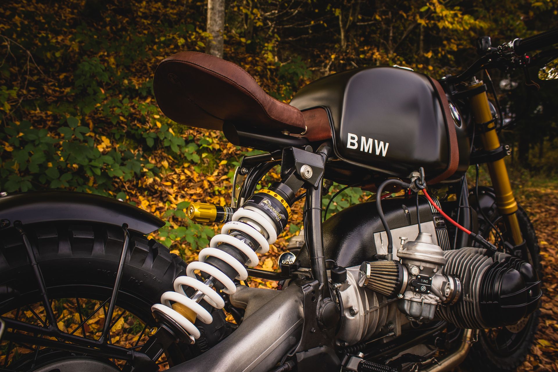 Das Bike wurde mit vielen Details verfeinert und aufgebaut. Unter anderem ist auch ein Tank eines Monolevermodells für einen klassischeren Look verbaut worden. Der Tankgurt wurde eigens angefertigt, wie auch der Sitz mit der kompletten Unterkonstuktion und Sitzwanne – alles handgemacht, nichts aus der Schublade!